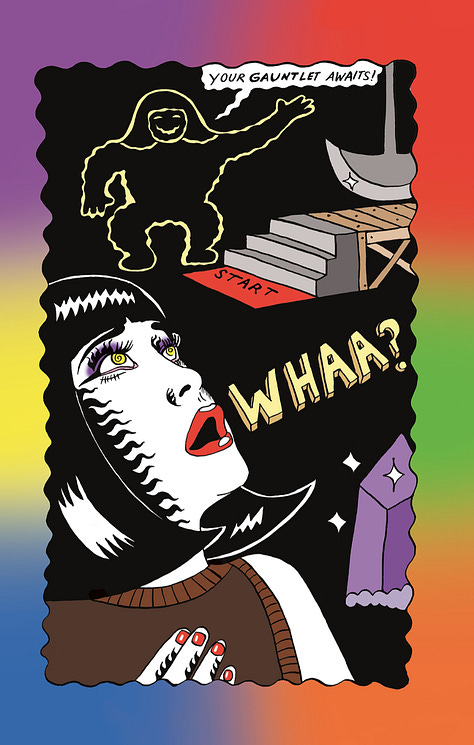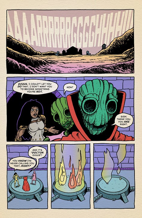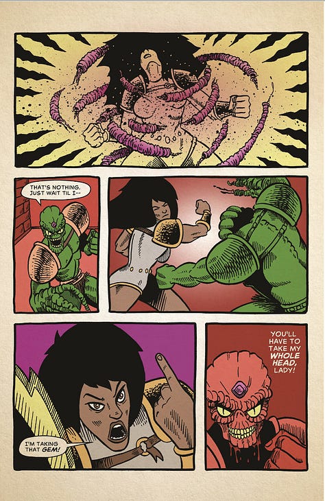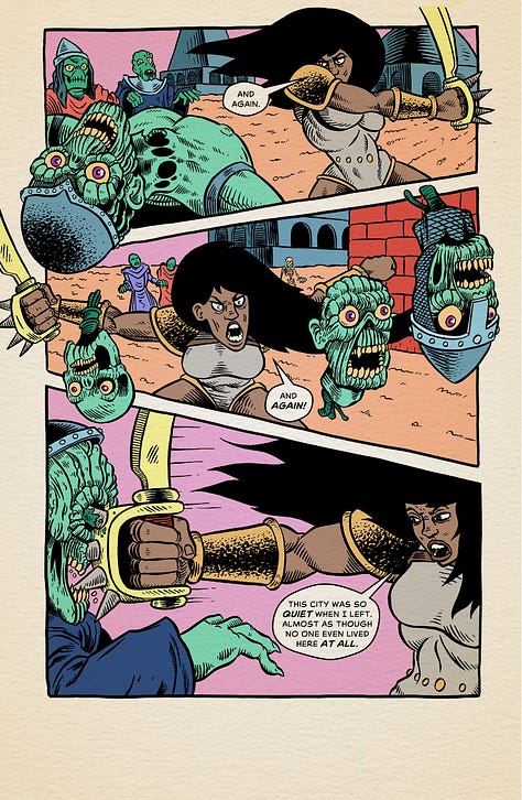 “In a wasteland twisted by mutants, magic, and machines, she’s the one you hire when no one else comes back alive. This time, Soraya’s after the legendary Brain Gem for her Pal, Dr. Evuus. The catch? it’s buried behind zombies, lizard warriors, and doors to nightmare dimensions. Steel will clash. Blood will spill. Soraya will get paid.”