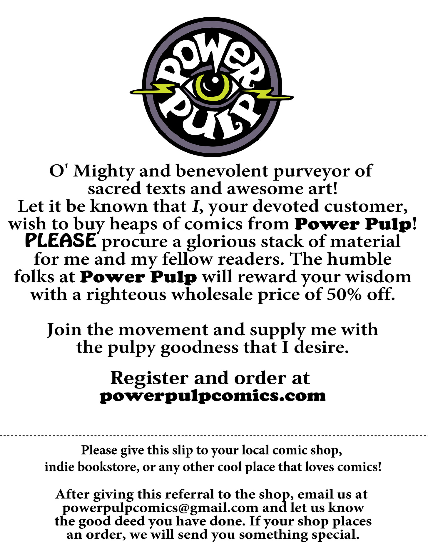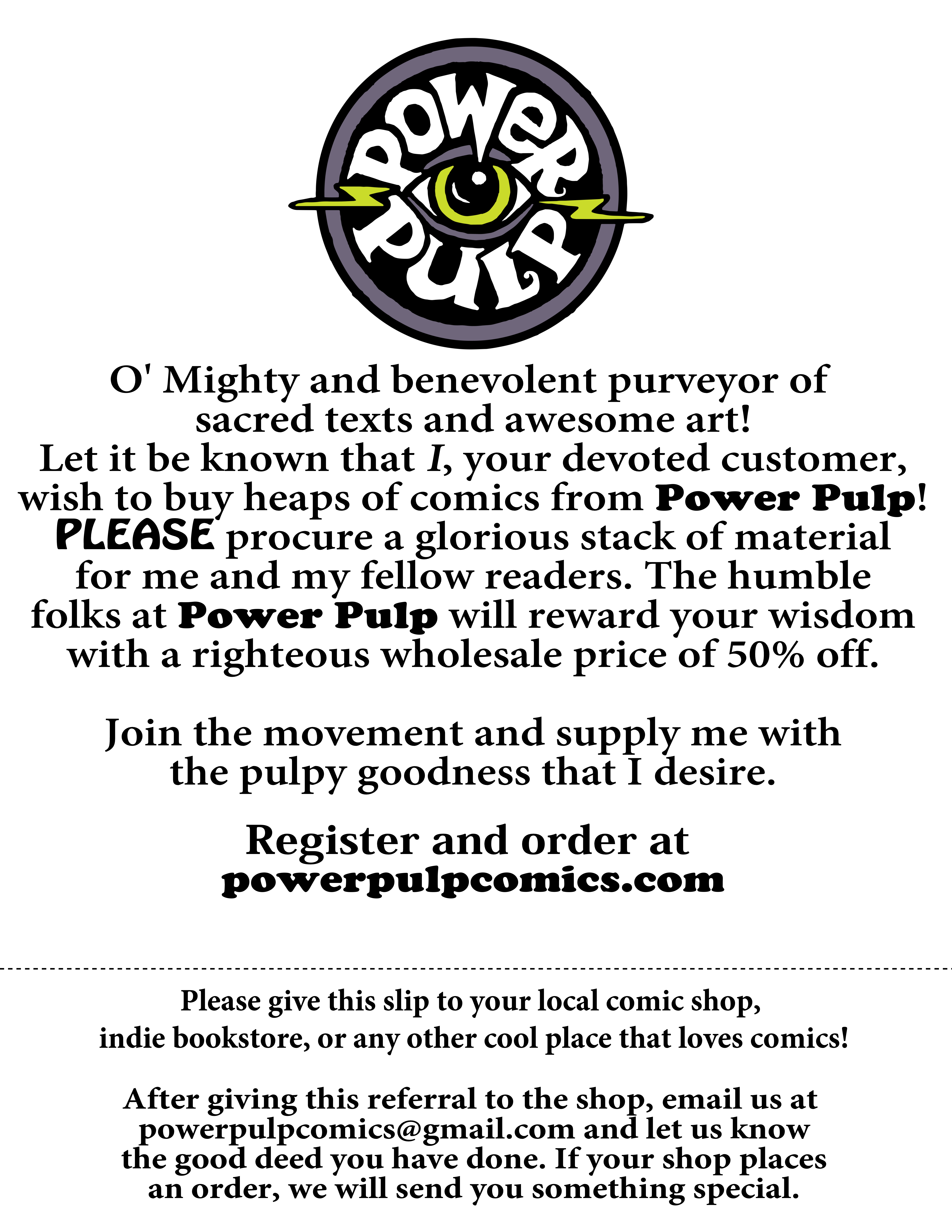 And if you want to see Power Pulp comics in your store, tell your LCS and make that happen! print off this slip and who knows… you may just get a little gift!