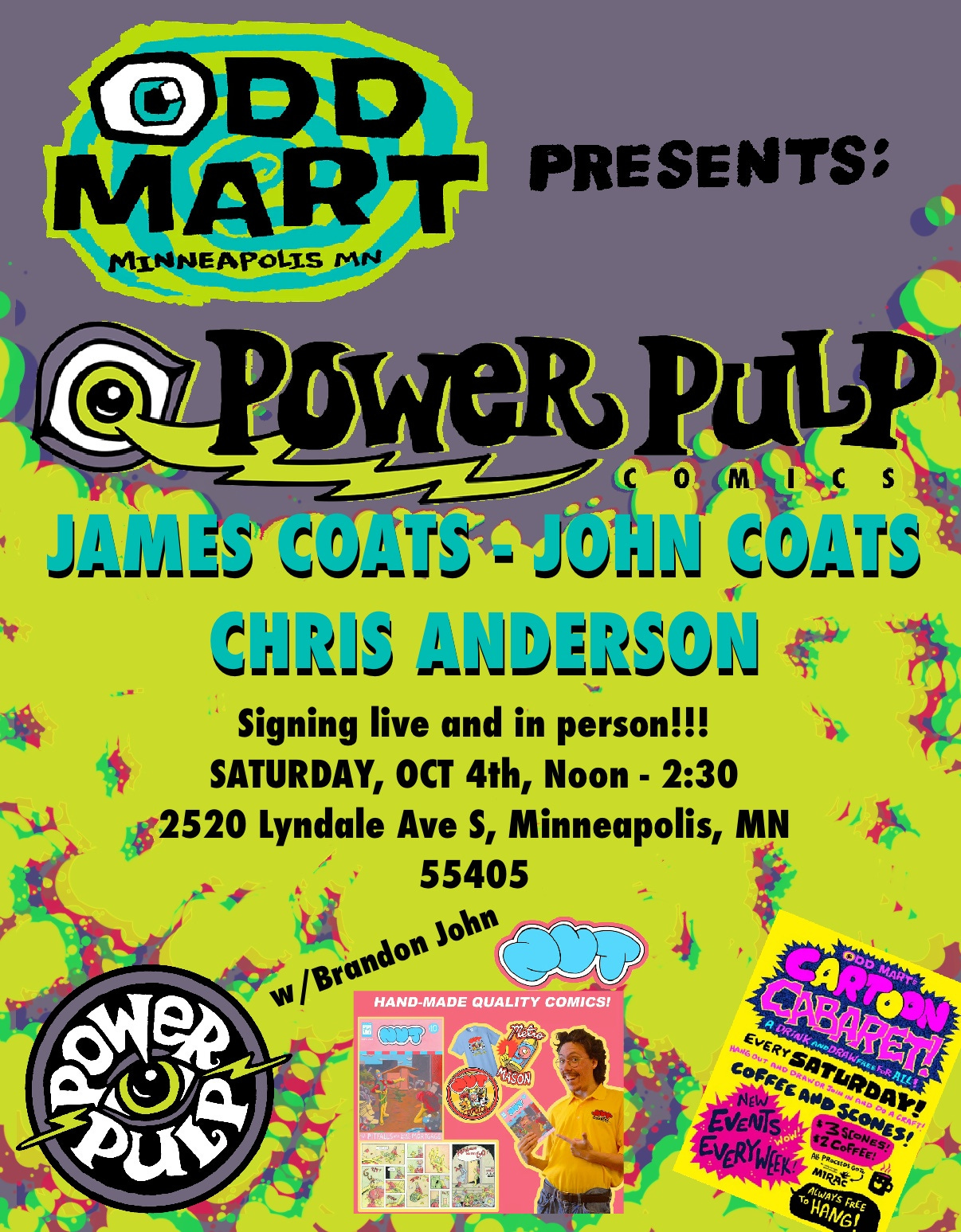 , John Coats, and James Coats are doing our first Power Pulp Pop-up at Odd Mart in Minneapolis, MN. So if you are in the area, mark your calendars! Because it’s going to be an awesome day of comics and fun! (I know I can’t wait to hear all about the event!)As always, thank you to these amazing shops for jumping in and supporting the pulp!